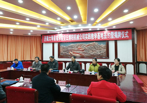 2016年12月30日,濟南大學泉城學院與安丘博(bó)陽機械公司實踐教學基地(dì)掛牌儀(yí)式(shì)隆重舉(jǔ)行。泉城學院(yuàn)劉增夕(xī)副院長、安丘博陽機械閆吉祥總(zǒng)經理、