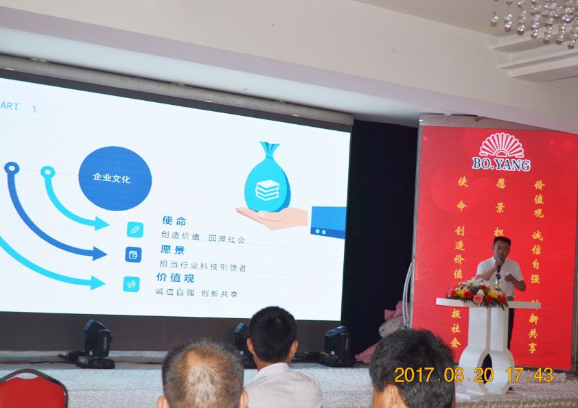 2017年8月20日下(xià)午,安丘博陽機(jī)械製造有限公司2017年度年中總結會議暨下半年目標(biāo)達成(chéng)動員大會在安丘匯泉酒(jiǔ)店召開。總經理閆(yán)吉祥(xiáng),副總