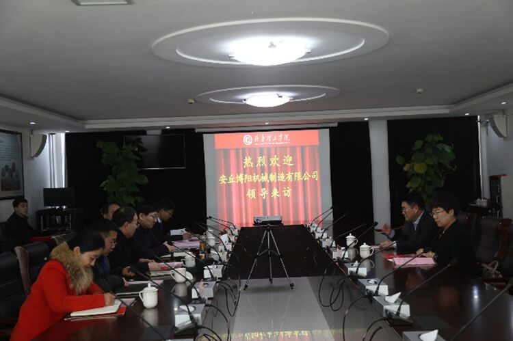 為深入貫徹落實國家(jiā)關於產教融合、校企合作的(de)指導精神,大力推行校企協同育人(rén)新模式,全麵提升複合型技術人才的培養能力。2019年3月2日,安丘博陽機械與齊魯理工學(xué)院在院圖(tú)書館五樓順利召開產學研合作洽談會。安丘博陽機械製造(zào)有限公司總經理閆(yán)吉祥、副總經理孫紅金(jīn)、齊魯理(lǐ)工學院副校長張庚靈、電子信(xìn)息(xī)學科帶頭人特聘教授袁東風出席會議,理工學院院長黃明鍵(jiàn)及相關副院長(zhǎng)參加了會(huì)議。會議由黃明鍵院長主持。