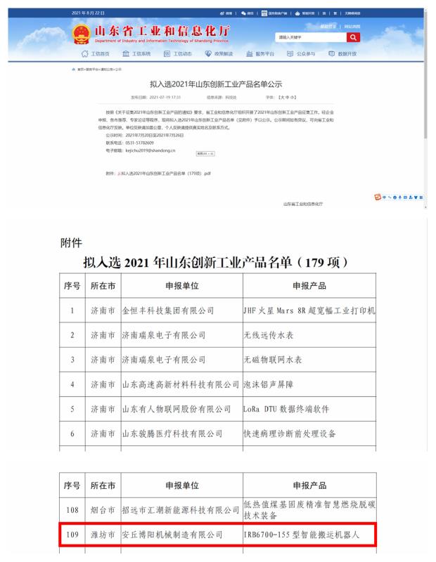 祝賀安丘博陽機械製造有限公司入圍“山東民(mín)營企業創新潛力100強”,安丘(qiū)博陽機(jī)械製造有限公司的申報產品“IRB6700-155型智能搬運機器人”擬入選2021年山東創新工業產品(pǐn)名單(dān)。