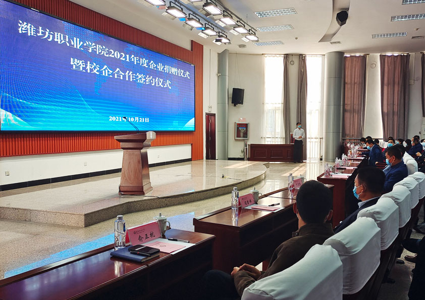 2021年10月21日,濰坊職業學院2021年度企業捐贈儀式暨校企合(hé)作簽約儀式(shì)在濰坊職業學院隆重召開。濰坊職業學院黨委書記(jì)馬躍啟、濰坊