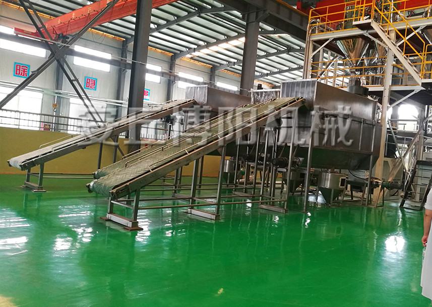 聚乙(yǐ)烯自動拆包機需要人工(gōng)或者機(jī)械手將原料包裝袋放置在輸送裝置上,上袋輸送機自(zì)動將袋裝粉粒物料送至拆包機內,由快速旋轉的刀(dāo)片將包裝袋割開,原料由滾動篩篩孔落入出料受料鬥內,包裝袋(dài)由旋轉的滾筒(tǒng)旋至排袋機排除,割包產生(shēng)的揚塵經乙(yǐ)萘酚自動拆包機自(zì)帶(dài)的(de)布袋除塵氣處理,布袋收集的粉塵通過脈衝清灰裝(zhuāng)置落入拆包機內,實現的粉塵的再次利用,經布袋除塵器處理(lǐ)的空氣可以直接排放在室內。拆解的原料經(jīng)出料螺旋(xuán),經過(guò)提升機,螺旋輸送機,管鏈輸送機,氣(qì)力輸送(sòng)等輸送(sòng)設備(bèi)傳輸至攪拌設備,生產(chǎn)後的(de)成(chéng)品再經輸送裝備進入安(ān)丘(qiū)博(bó)陽機械的自(zì)動包裝機,後(hòu)形成可供銷售(shòu)的成品。